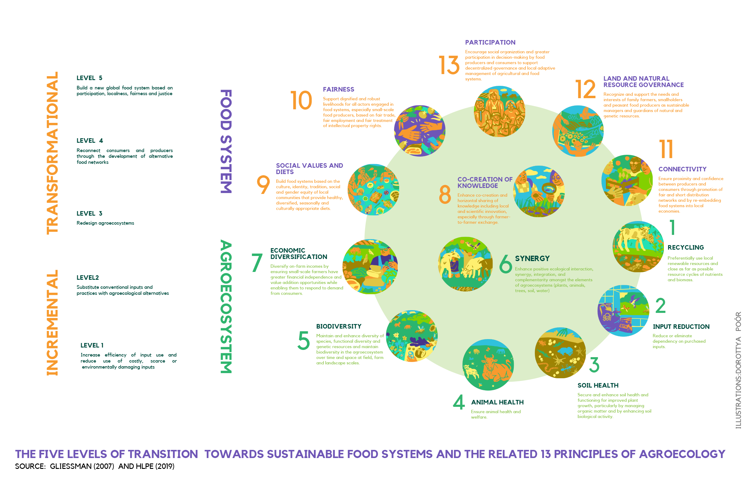 Agroecology integrates ecological and social principles into food systems. The 13 principles include
